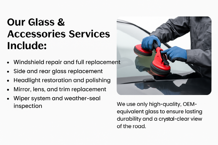 We also offer a range of accessory repair and replacement services, including trim, moldings, and lighting components. Our goal is to restore the original function and appearance of every detail — because even the smallest part contributes to your vehicle’s overall safety and finish.